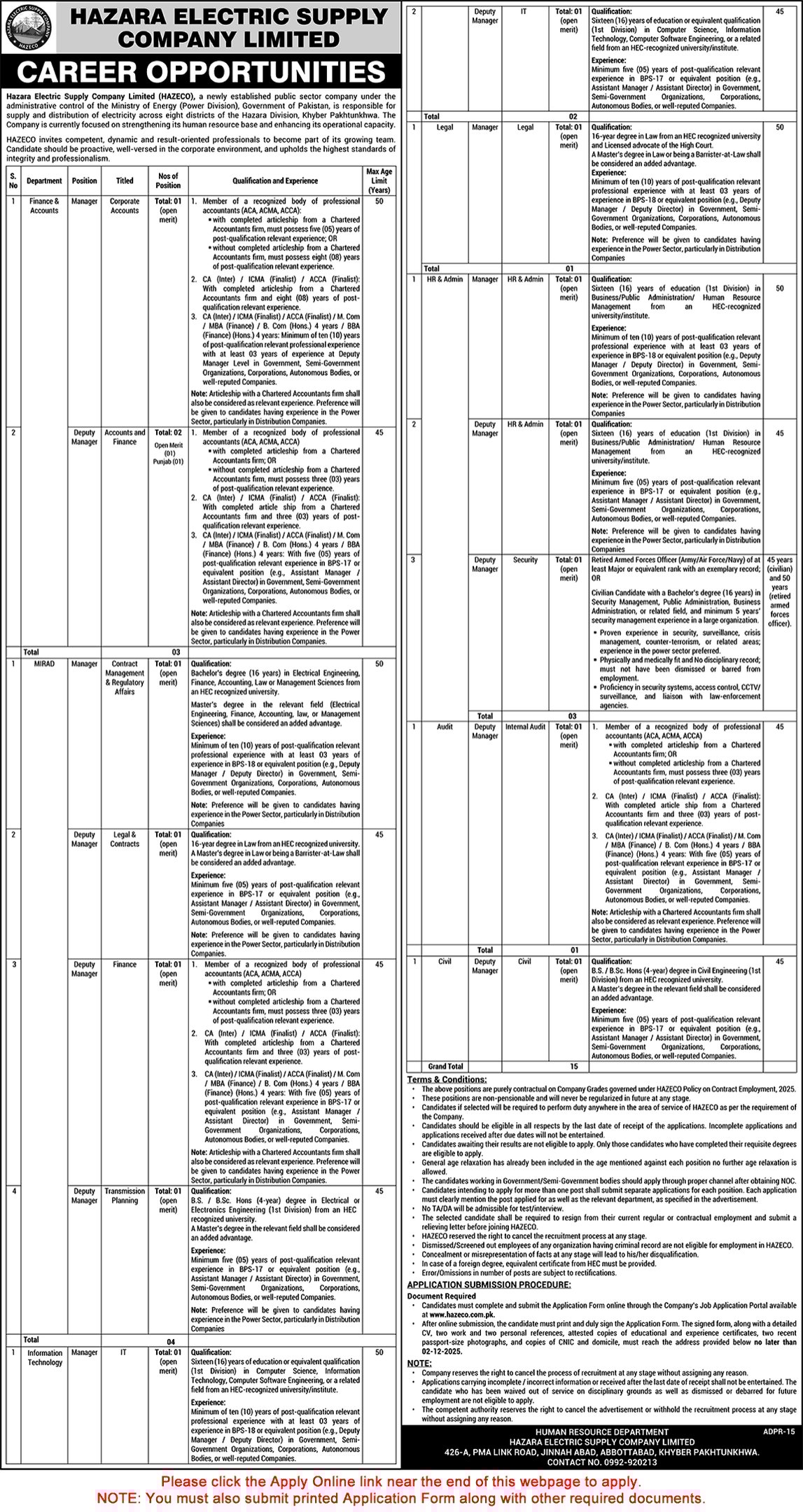 Deputy / Manager Jobs in HAZECO November 2025 WAPDA Online Application Form Latest